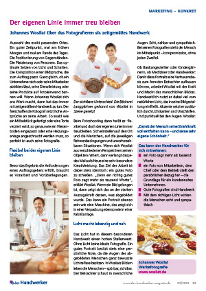 Wenn Johannes Wosilat sich ans Werk macht, dann hat das immer mit zeitgemäßem Handwerk zu tun. Der freischaffende Fotograf setzt hohe Ansprüche an seine Arbeit. So exakt wie ein Möbelstück gefertigt oder eine Torte verziert wird, so genau wie ein Fliesenboden eingepasst oder eine Heizungsanlage angeschraubt werden muss, so perfekt ist auch seine Fotografie.