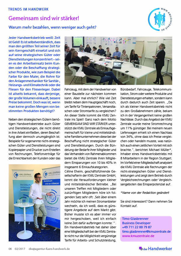 Céline Eheim, geschäftsführende Gesellschafterin der KMU Zentrale GmbH, kennt die Herausforderungen kleiner und mittelständischer Betriebe. „Bei unseren Treffen mit Mitgliedern oder zukünftigen Mitgliedern höre ich folgenden Satz sehr oft: ‚Seit über einem Jahr möchte ich meinen Stromanbieter wechseln, da ich weiß, dass es günstigere Angebote auf dem Markt gibt. Bisher musste ich es aber immer vor mir hergeschoben, weil ich einfach keine Zeit dafür aufbringen konnte.‘“. Ein Handwerksbetrieb hat daher über eine Mitgliedschaft bei der KMU Zentrale nicht nur die Möglichkeit vergünstige Tarife für Arbeits- und Schutzkleidung, Bürobedarf, Fahrzeuge, Telekommunikation, Strom oder weitere Produkte und Dienstleistungen erhalten, sondern kann durch dadurch auch Zeit sparen. „Da ich als kleiner Handwerksbetrieb nicht zu den Großabnehmern zähle, bekam ich in der Vergangenheit keine großen Nachlässe. Durch das Angebot der KMU Zentrale wurde meine Stromrechnung um 11% günstiger. Bei meinem neuen Lieferwagen erhielt ich einen Nachlass von 34%, ohne dass ich Preise vergleichen oder handeln musste, was natürlich auch einen zeitlichen Vorteil mit sich brachte.“, berichtet Michael Müller*, Inhaber eines Handwerksbetriebs mit 8 Mitarbeitern in der Region Stuttgart.