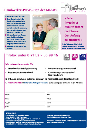 * Seien Sie authentisch. Der Kunde möchte einen Fachmann haben und als dieser dürfen Sie einem Kundenwunsch auch widersprechen, wenn er beispielsweise technisch nicht machbar ist.