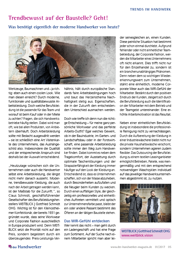 „Heutzutage wünschen sich die Unternehmen oder auch die Handwerker selbst eine Arbeitskleidung, die längst nicht mehr danach aussieht. Moderne, trendbewusste Kleidung, die auch nach der Arbeit getragen werden kann, ist der Maßstab für die Zukunft.“, so Claus Schmidt, geschäftsführender Gesellschafter des Berufskleidungsherstellers WEITBLICK | Gottfried Schmidt OHG. Wichtig ist für den Kleinostheimer Konfektionär, der bereits 1931 gegründet wurde, dass seine Workwear und Corporate Fashion ausschließlich in Europa produziert wird. Denn WEITBLICK setzt die Priorität nicht auf den Preis, sondern begeistert durch ein überzeugendes Preis-Leistungs-Verhältnis, hält durch europäische Standards faire Arbeitsbedingungen hoch und baut das Herzensthema Nachhaltigkeit stetig aus. Eigenschaften, die in der Zukunft den entscheidenden Unterschied ausmachen werden.