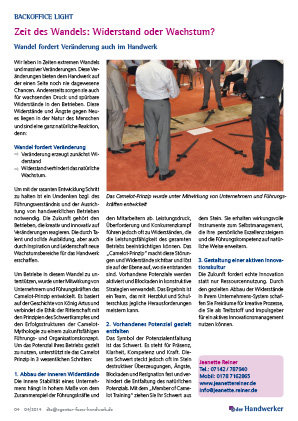 Wandel fordert Veränderung auch im Handwerk Wir leben in Zeiten extremen Wandels und massiver Veränderungen. Diese Veränderungen bieten dem Handwerk auf der einen Seite noch nie dagewesene Chancen. Andererseits sorgen sie auch für wachsenden Druck und spürbare Widerstände in den Betrieben. Diese Widerstände und Ängste gegen Neues liegen in der Natur des Menschen und sind eine ganz natürliche Reaktion, denn: